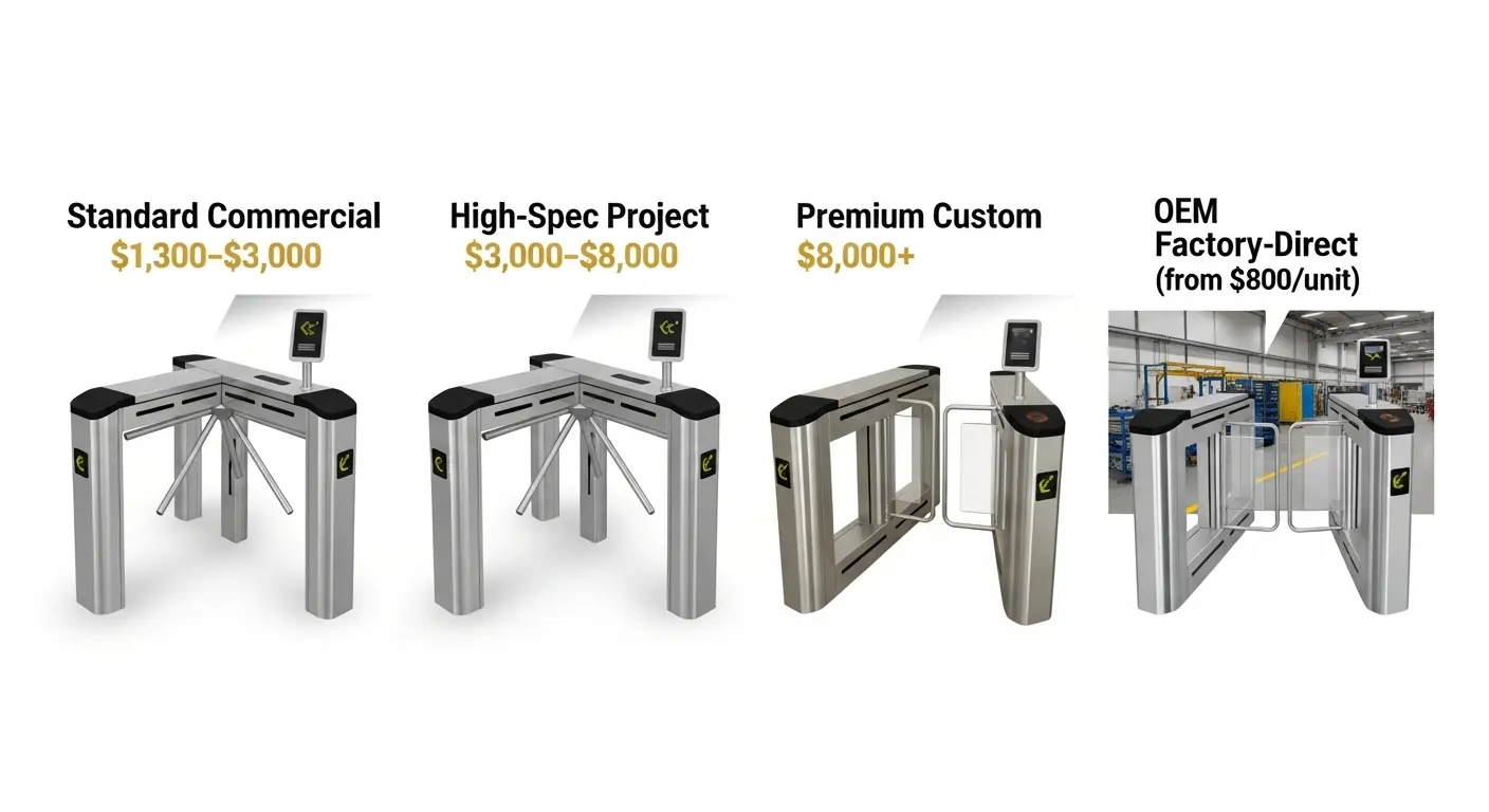 Цены на турникеты с быстрыми воротами варьируются от $1,300–$5,000 для стандартных коммерческих моделей и $2,000–$8,000 для проектных конфигураций с высоким уровнем. Заводские заказы OEM начинаются примерно от $800 до $920 за единицу для стандартных однополосных конфигураций, заказанных по объёму проекта. Широкий диапазон отражает реальные различия в типе двигателя, Материал корпуса, Спецификации стекла, и включены ли считыватели удостоверений квалификаций — а не произвольная наценка поставщика. Для точного числа, Отправьте свой счёт полос, Тип квалификации, и спецификации окружающей среды для получения детализированной заводской сметы.