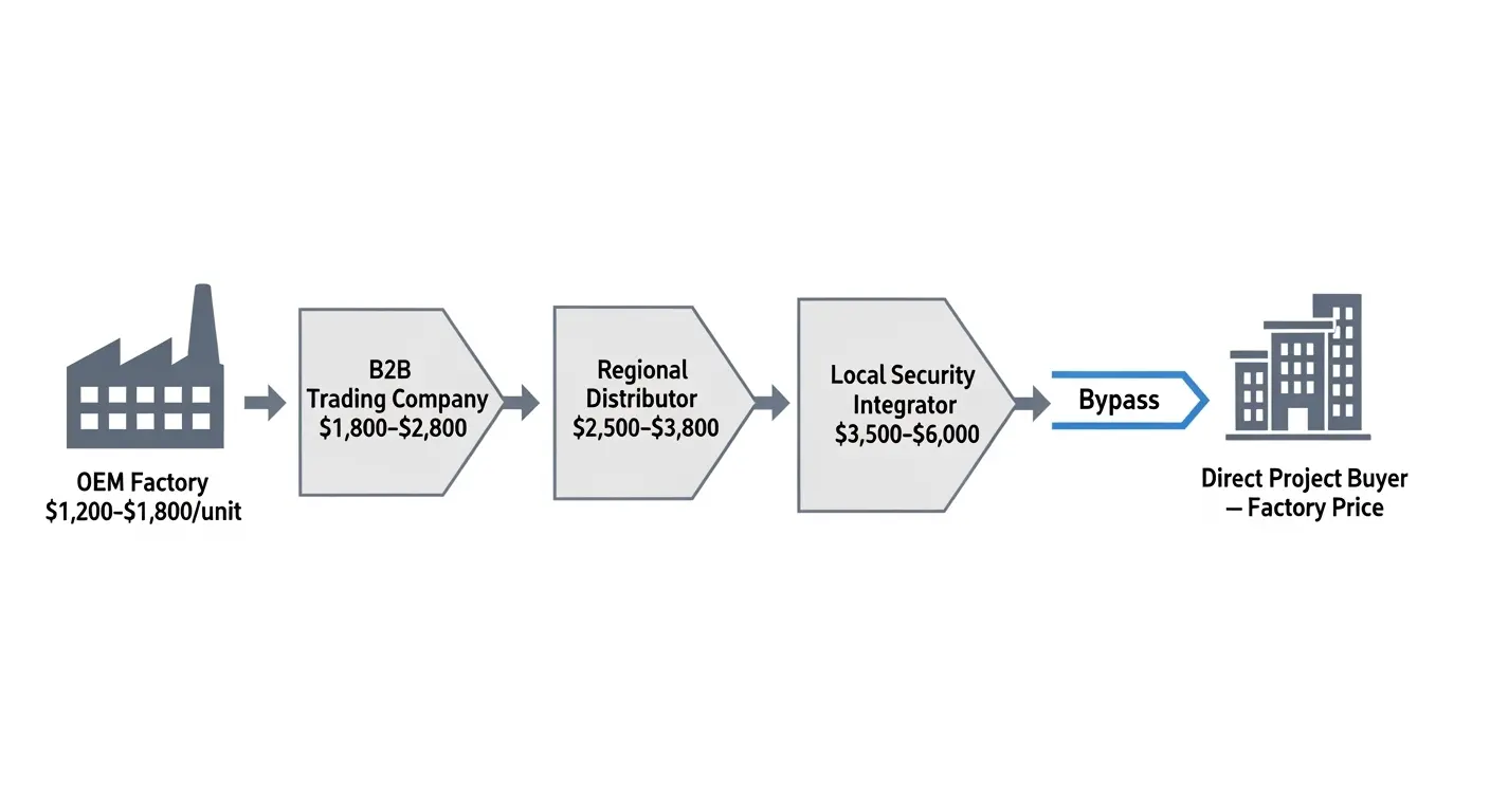 Тот же элемент спецификации может появиться на $1,500 Фабричный прямой и $4,500 через локальный интегратор безопасности — а 200% Различия на идентичном оборудовании. Различия возникают из-за уровней каналов реселлеров между заводом и покупателем, а не из-за различий в качестве продукции. B2B-торговая компания добавляет маржу 30–55%, региональный дистрибьютор добавляет 65–110%, а локальный интегратор может добавить 100–200% . Покупка напрямую с завода у сертифицированного производителя полностью убирает эти слои наценки.
